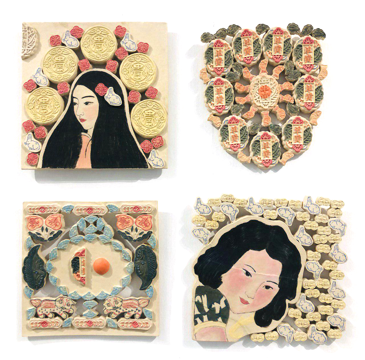 “The works are woven together through repeated imageries of mooncakes, rabbits, and egg yolks. Emerging from these icons are two female figures from Chinese culture. Depicted with overflowing hair, Chang’e is the heroine in a tragic folk tale who was given immortality at the expense of being separated from her husband. Smiling with rosy cheeks is the iconic face on the cover of a popular makeup powder owned by the artist’s grandmother. known for keeping women’s faces smooth and youthful, the powder is another symbol of the desire for eternal youth. By incorporating the objects of her childhood with these age-old tales, Shayne makes personal timeless narratives – Shedding light on how the myths and beliefs that sustained ancient worlds can be accessible to present times.”