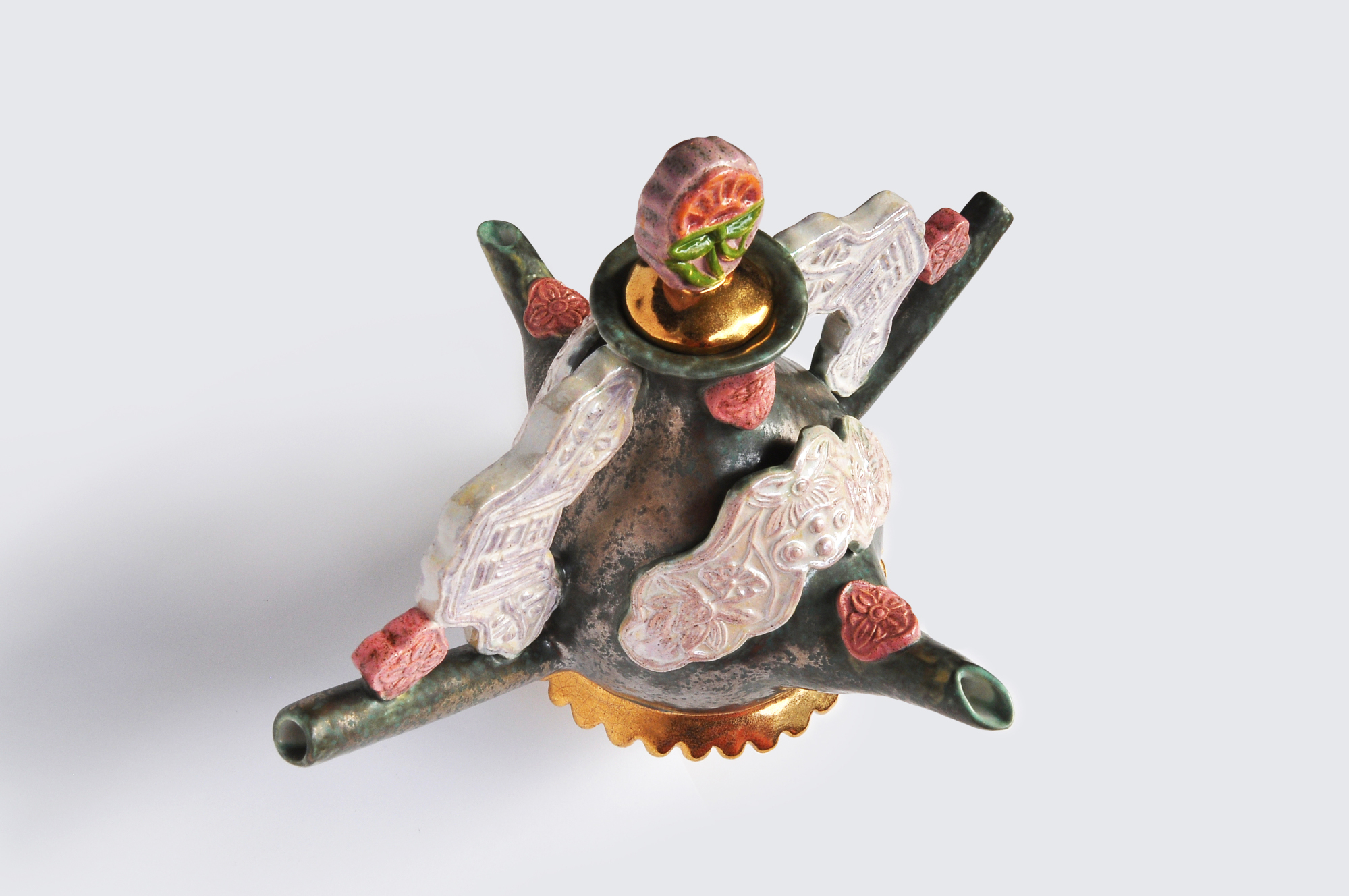 In this piece, pastries are being used as connector structures between the spout and the vessel body, somewhat like handles and also as the lid holder of the vessel.