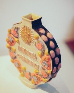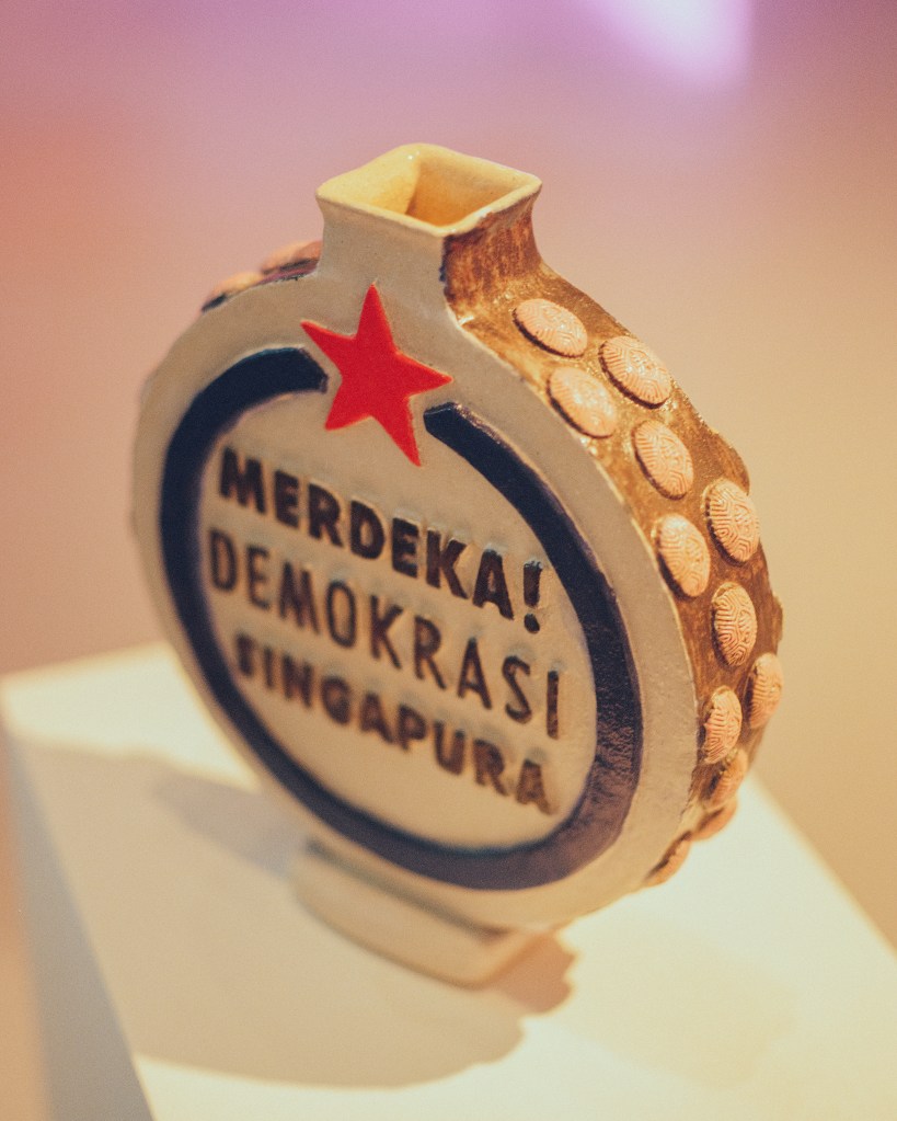 In blue and red is the logo of Barisan Sosialis, and on the other side is my rendition of it, like a flower garland. The Medusa with gold lustre is a brass stamping I have collected and like the pastries mold, I created a mold out of it. Utilized on this piece, Medusa symbolize victim blaming. Till today, prominent members of Barisan Sosialis are still being accused of various incidents thus justifying the arrest–a form of victim blaming in the state official narrative. The piece also contains, on both sides, letters cut out individually, of a font reflective of the period in the 60s.
