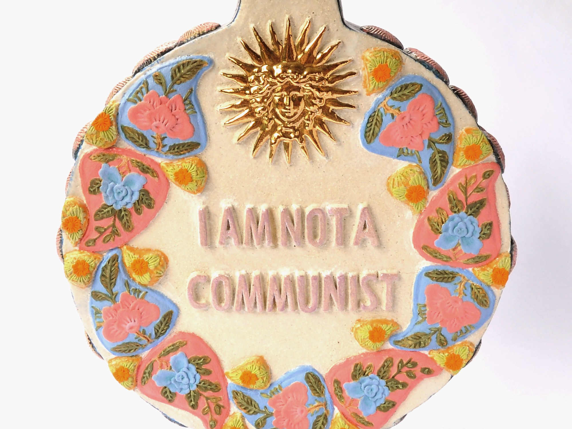 In blue and red is the logo of Barisan Sosialis, and on the other side is my rendition of it, like a flower garland. The Medusa with gold lustre is a brass stamping I have collected and like the pastries mold, I created a mold out of it. Utilized on this piece, Medusa symbolize victim blaming. Till today, prominent members of Barisan Sosialis are still being accused of various incidents thus justifying the arrest–a form of victim blaming in the state official narrative. The piece also contains, on both sides, letters cut out individually, of a font reflective of the period in the 60s.