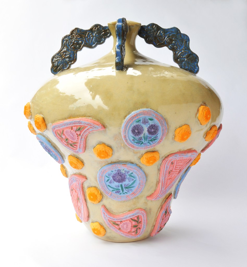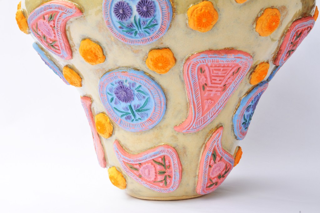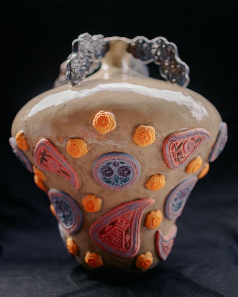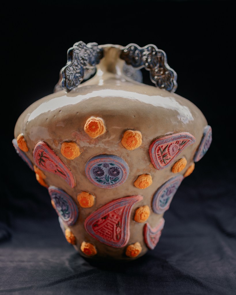 Handle-like structure lying on the shoulder and opening of the vessel are created from pastries mould, and they are not made to function as handles but an idea of functionality. The pastries pattern around the body are matte to create a contrast of tactility and a diversity of the sense of touch.
