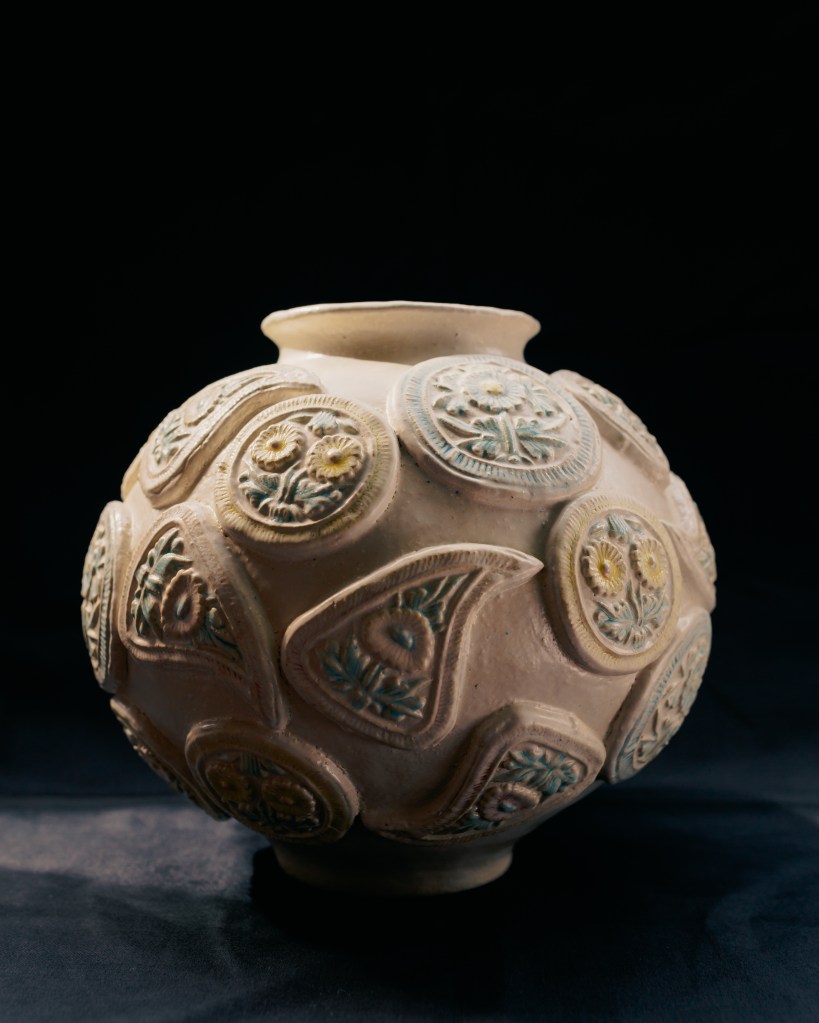 Sun-kissed moon is inspired by Moon jar made during Joseon dynasty. Three types of pastries were arranged around the round pot. It is named Sun-kissed moon because of its warmer colour tone. I imagined the Sun kissing the moon, giving more warmth to the cold.