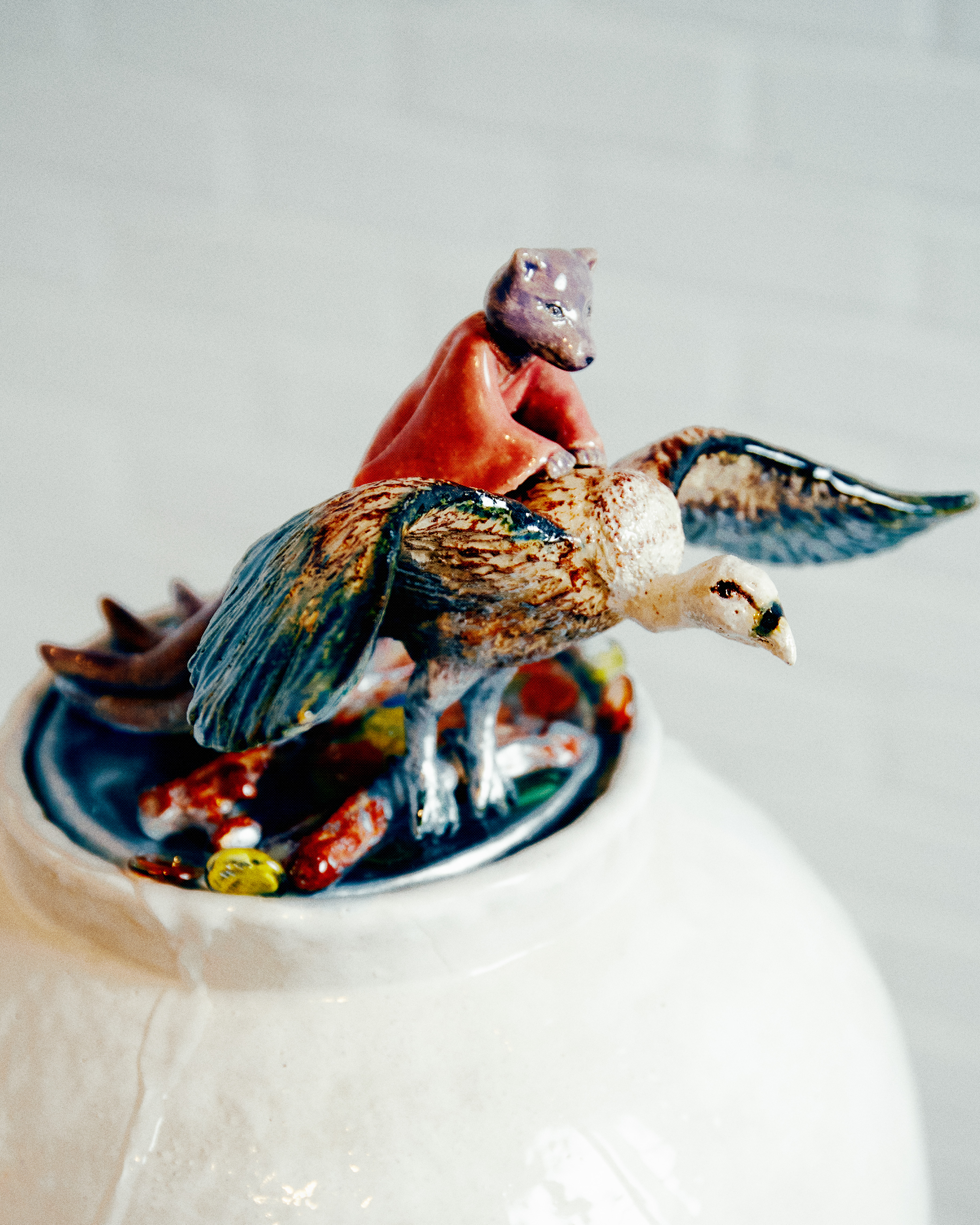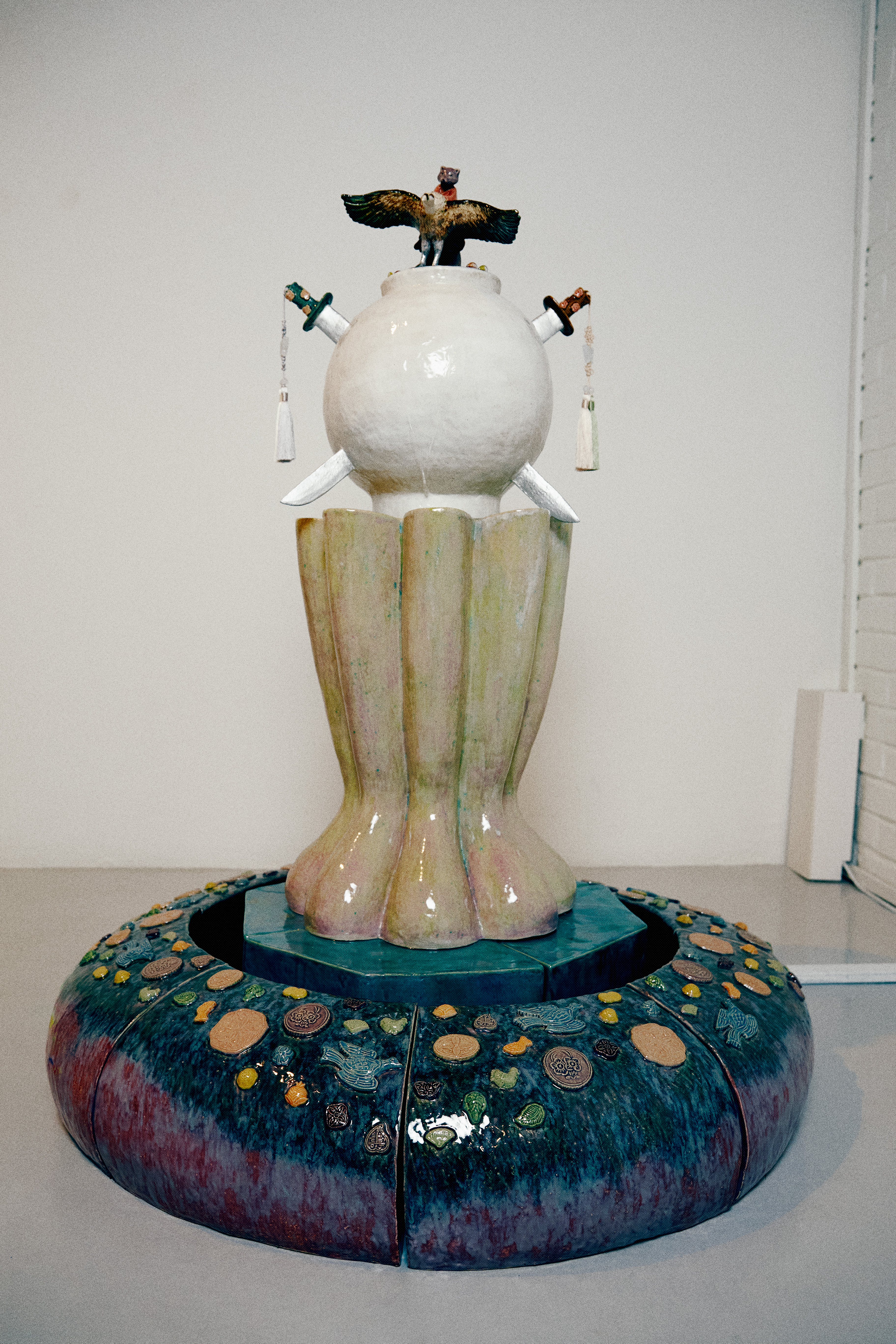 This work is one of several ceramic fountains created for the present exhibition, and the largest. In its iconographic repertoire, it also serves as a visual summary of the themes of the show, incorporating motifs that are seen in many other pieces: from the nine-tailed fox of East Asian myth, to the moon jar and geommu (traditional dance) sword of Korean culture, to the kueh (pastry) shapes that have become a familiar part of Phua’s vernacular. Here, the nine-tailed fox is seen riding a vulture – two creatures generally regarded as undesirable in myth and popular culture. The poly-caudal fox is often portrayed as a shapeshifting entity capable of taking on human guise for its own nefarious ends, while the vulture, though typically villainized, is key to the Tibetan mortuary practice of sky burial, in which the corpse is left out in the open to decompose or to be devoured by scavenging animals. The piercing of the moon jar by a blade is a feminist statement on neo-Confucian ideas of feminine chastity and purity, inspired by a South Korean film about the country’s first male courtesan, Homme Fatale (2019). The shapes of the kueh were created using vintage moulds collected by the artist, informed by her interest in matters of heritage, labour and ornamentation. (Refer to the texts for You turn Confucius on his head, The ornamented knife confronts the pure, unadorned moon and the “Lazy Chinese bonsai” series, respectively, for elaboration.)