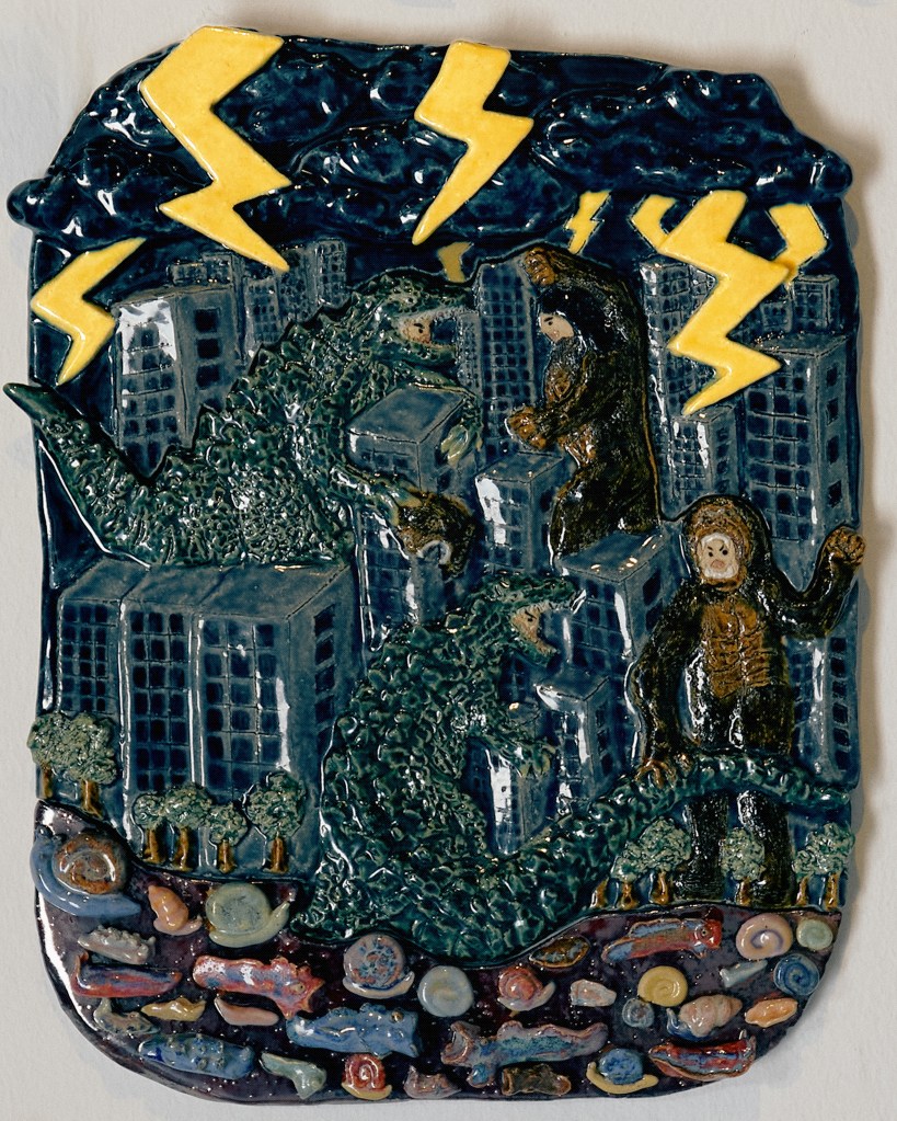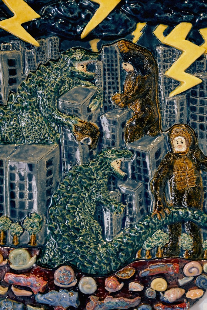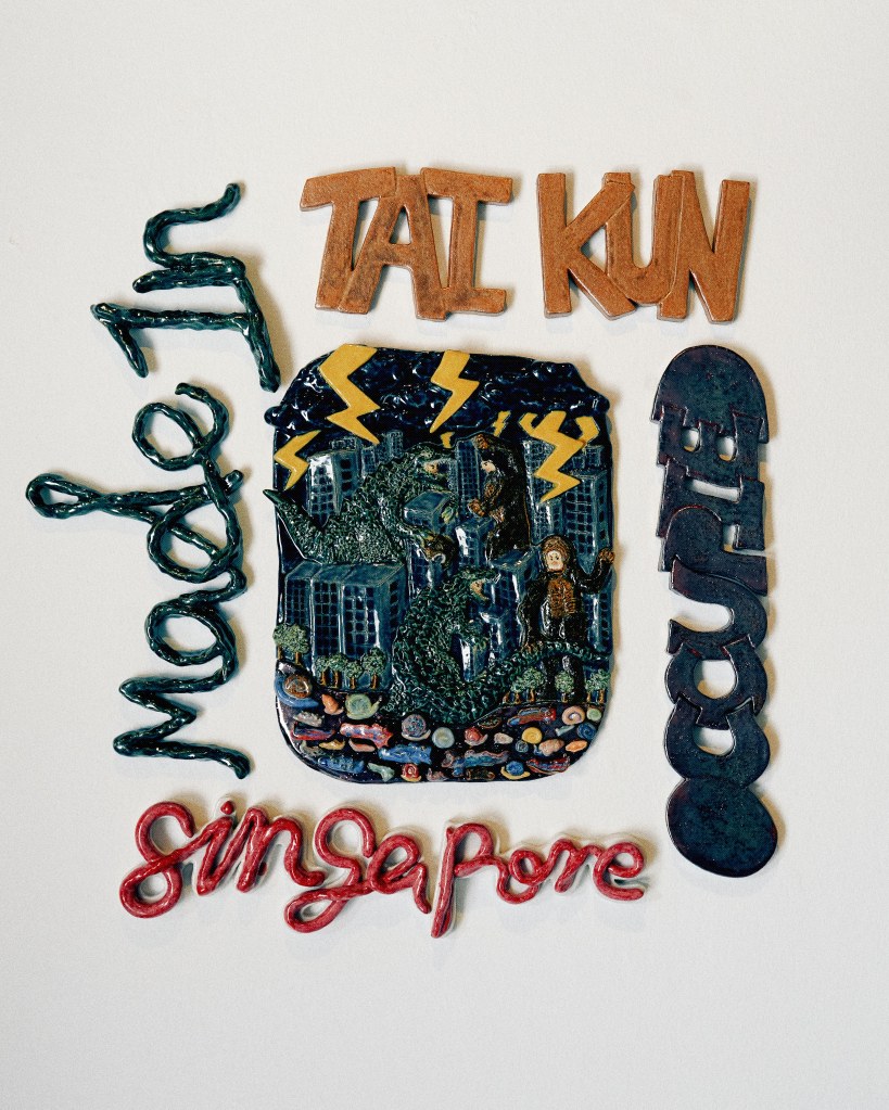 Against a backdrop of a HDB (Housing Development Board) estate, a pair of Godzillas battle two King Kongs. HDB BTO (built to order) apartments have become a hot commodity among young Singaporeans, as home prices shoot ever upward in the land-scarce city – a fact that Phua pokes fun at with her paired-off monsters, as these coveted pieces of real estate are, according to official policy, only available to married couples and families. The artist notes that the already high cost of living – including housing – is being affected by the arrival of wealthy foreigners drawn to Singapore’s comparatively relaxed tax laws. The scene on the panel is accompanied by the disclaimer, “Made in tai kun occupied Singapore.” It was inspired by a similar text, “Made in occupied Japan”, on a vintage jewellery box owned by the artist (which suggests that the object had been manufactured in Japan for the export market between 1945 and 1952, when the country was controlled by American forces). In referencing the historical title for the Japanese shogun, “Taikun”, Phua is excavating the etymological roots of the English cognate, “tycoon”, and alluding to present economic realities. She has also included bottom-dwelling, often disregarded creatures such as mudskippers and snails in the panel, and, overlooking all, a tempest of storm clouds and lightning bolts, the latter perhaps familiar as a symbol to Singaporeans. (Text by Louis Ho)