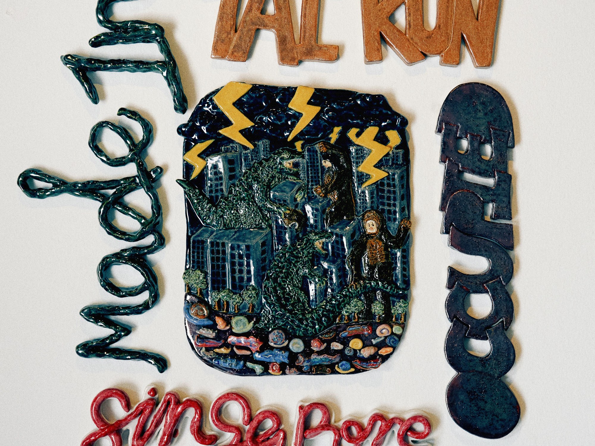 Against a backdrop of a HDB (Housing Development Board) estate, a pair of Godzillas battle two King Kongs. HDB BTO (built to order) apartments have become a hot commodity among young Singaporeans, as home prices shoot ever upward in the land-scarce city – a fact that Phua pokes fun at with her paired-off monsters, as these coveted pieces of real estate are, according to official policy, only available to married couples and families. The artist notes that the already high cost of living – including housing – is being affected by the arrival of wealthy foreigners drawn to Singapore’s comparatively relaxed tax laws. The scene on the panel is accompanied by the disclaimer, “Made in tai kun occupied Singapore.” It was inspired by a similar text, “Made in occupied Japan”, on a vintage jewellery box owned by the artist (which suggests that the object had been manufactured in Japan for the export market between 1945 and 1952, when the country was controlled by American forces). In referencing the historical title for the Japanese shogun, “Taikun”, Phua is excavating the etymological roots of the English cognate, “tycoon”, and alluding to present economic realities. She has also included bottom-dwelling, often disregarded creatures such as mudskippers and snails in the panel, and, overlooking all, a tempest of storm clouds and lightning bolts, the latter perhaps familiar as a symbol to Singaporeans. (Text by Louis Ho)