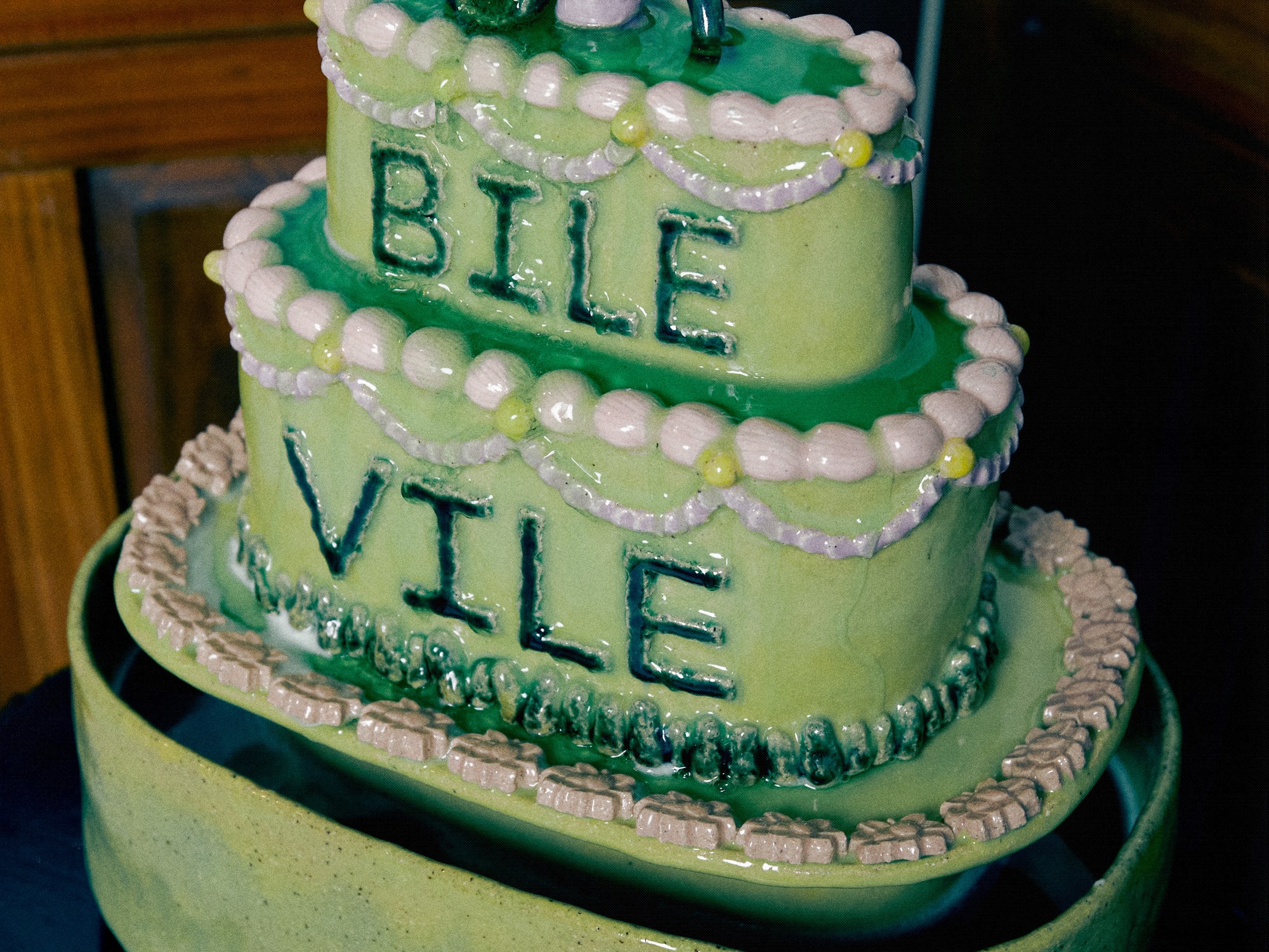 Phua is fascinated by fountains, and their connection to ceramics through the element of water. She notes that a crucial step in the process of producing ceramic pieces is firing, which eliminates, from the finished product, the moisture that was used to render the raw material malleable. “I enjoy the fountain’s ability to breathe life”, she remarks, “into the sculptural forms with their moving water. What’s interesting is that, in the process of making ceramics, water is a crucial medium, but upon completion, it is crucial to get rid of it. To introduce water back to the medium that once held itself together is a rather poetic reunion.” Here, the fountain assumes the form of a neon green birthday cake that reads “vile bile”, a reference to the narrative of the ancient Chinese king, Goujian. (See the series, I love working all day, every day.) The artist relates the moral of Goujian’s tale to a contemporary phenomenon: how things that are otherwise considered hardships have become sublimated into activities worthy of bragging rights – e.g. overworking, which have become a source of public pride for some on social media. The phrase “vile bile” suggests the enjoyment of something unpalatable, a transformation of Goujian’s self-inflicted suffering into a burden that contemporary society has embraced. (Text by Louis Ho)