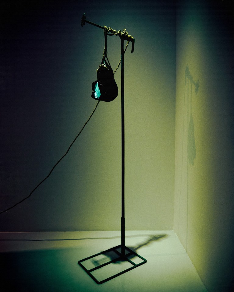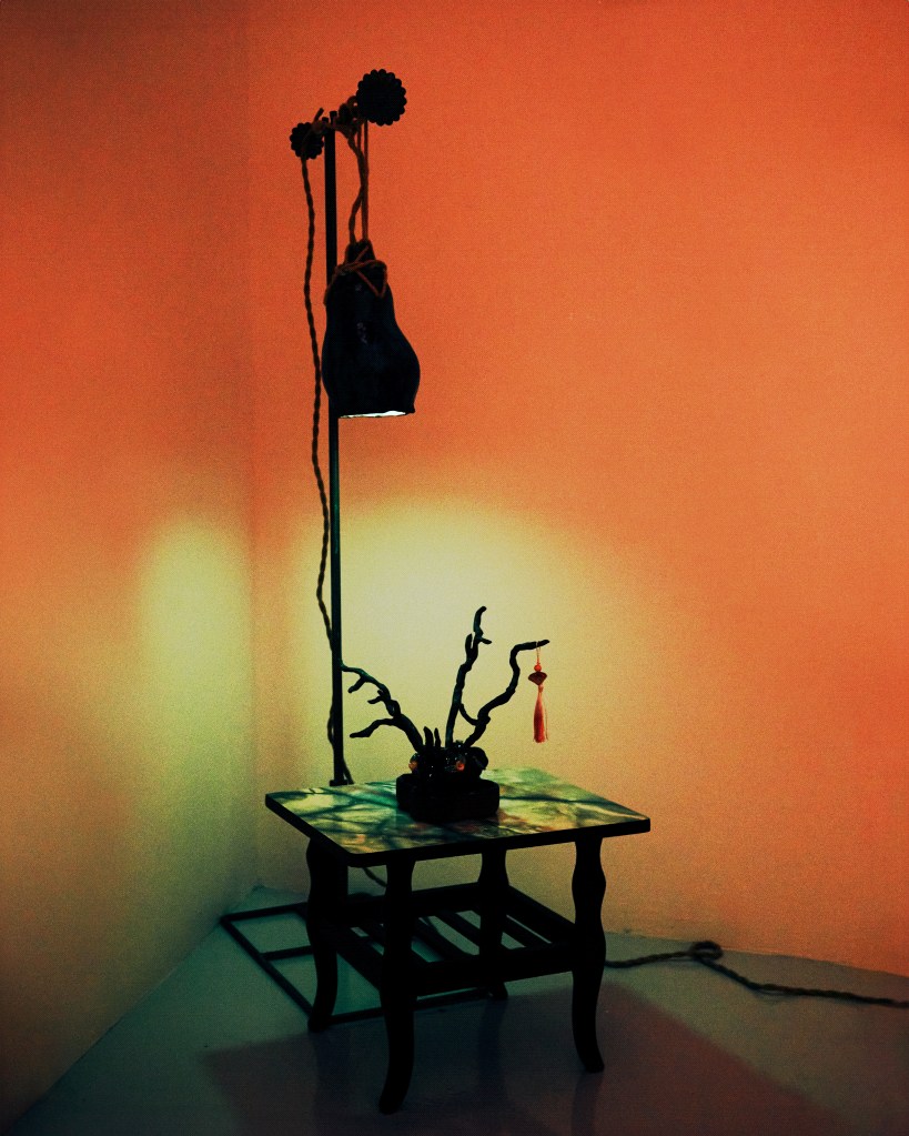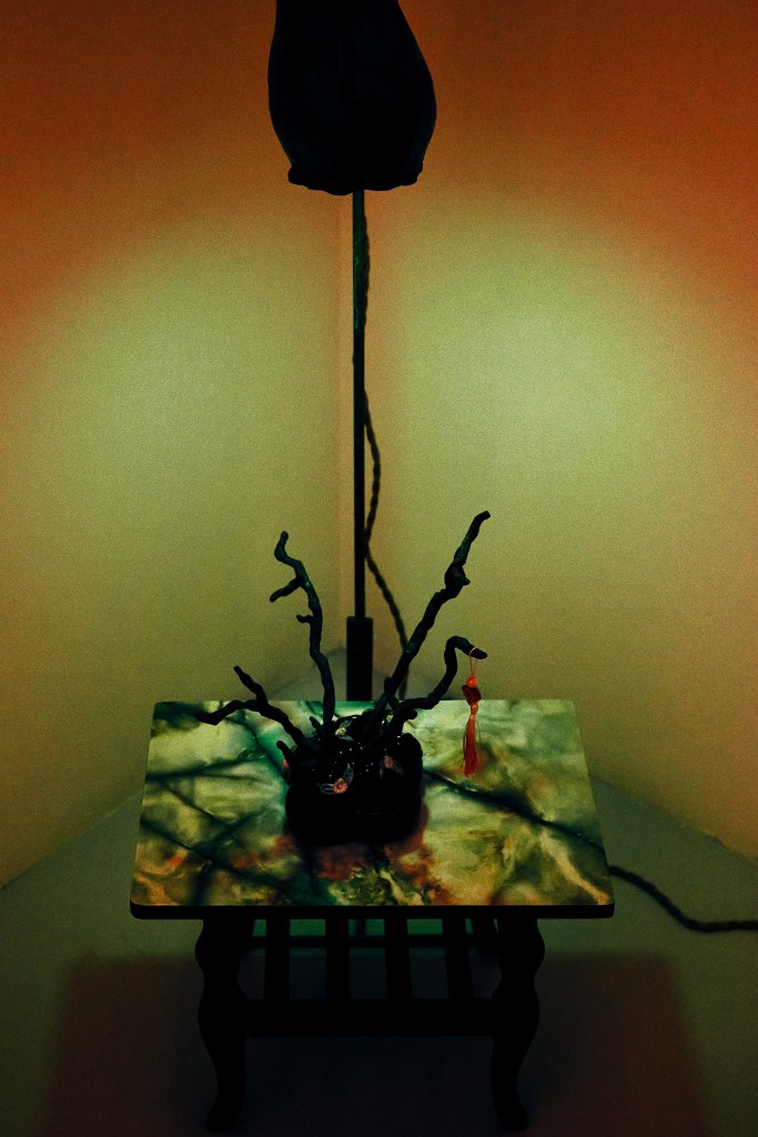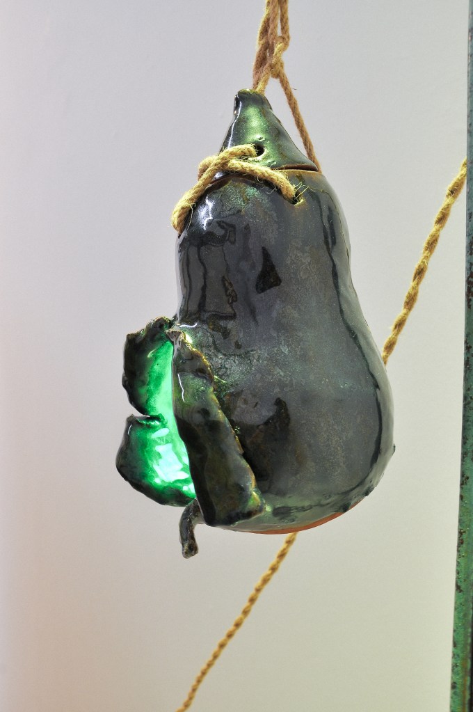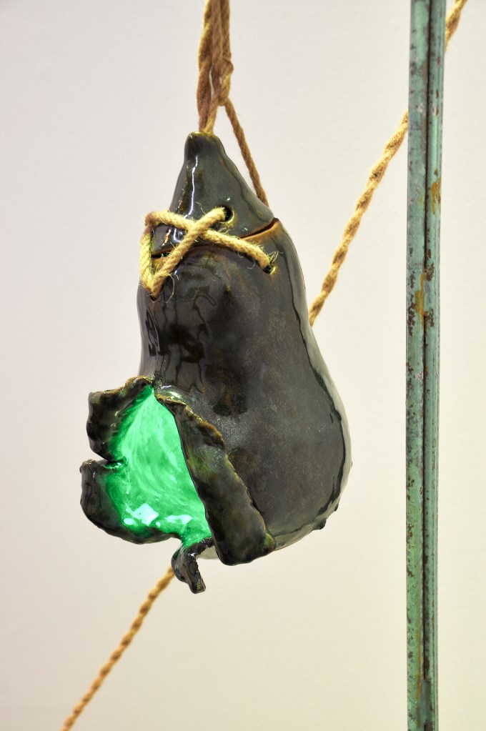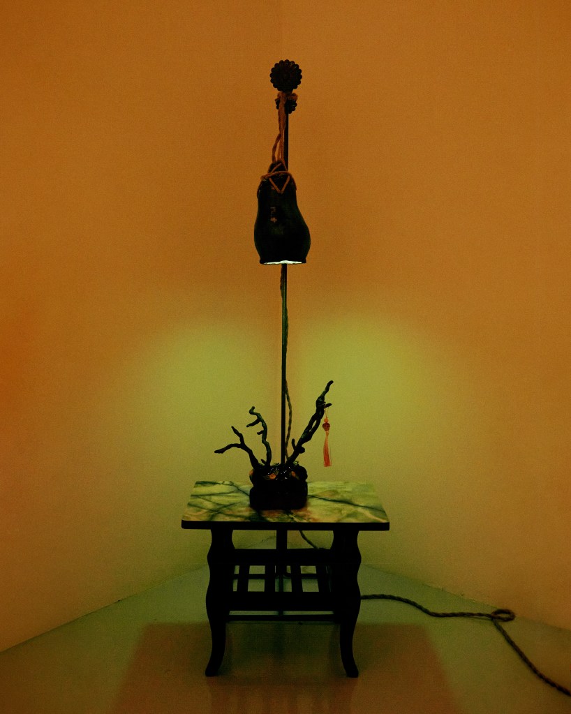 Goujian was a king of Yue, a state in southern China, who reigned in the fifth century BCE. He was captured by the neighbouring kingdom of Wu, and forced to serve the Wu suzerain for several years before being released. Upon resuming his former kingship, Goujian eschewed the good life and instead lived like a peasant, a constant reminder both of the humiliations he suffered during captivity and the need to avenge his debasement. As legend has it, one of his more extreme methods of self-mortification was the regular consumption of bile from a gallbladder – a well-known narrative that has become a morality tale extolling discomfort and endurance as a means to personal redemption. (The ancient Chinese historian, Sima Qian, among others, records the story.) Here, creating ceramic works in the form of a gallbladder is characteristic of Phua’s sense of whimsy; for her, the organ simply resembles a lampshade, and the juxtaposition of the visceral nature of the narrative and the innocuous utility of the object is where the fun lies. (Text by Louis Ho)