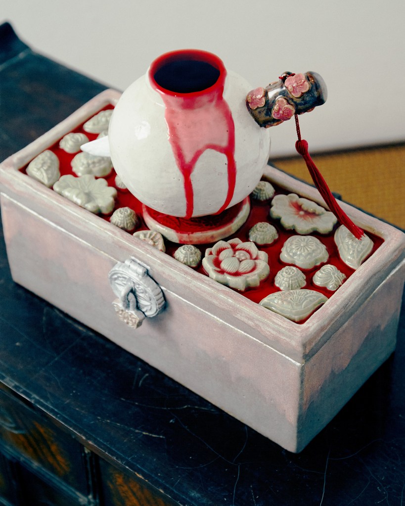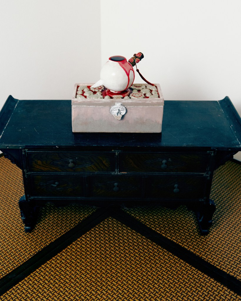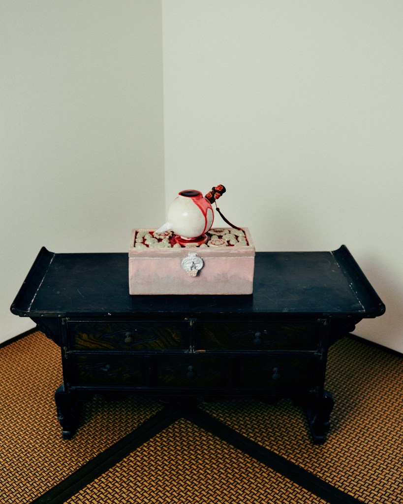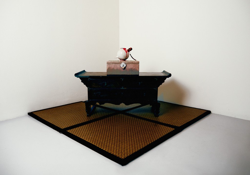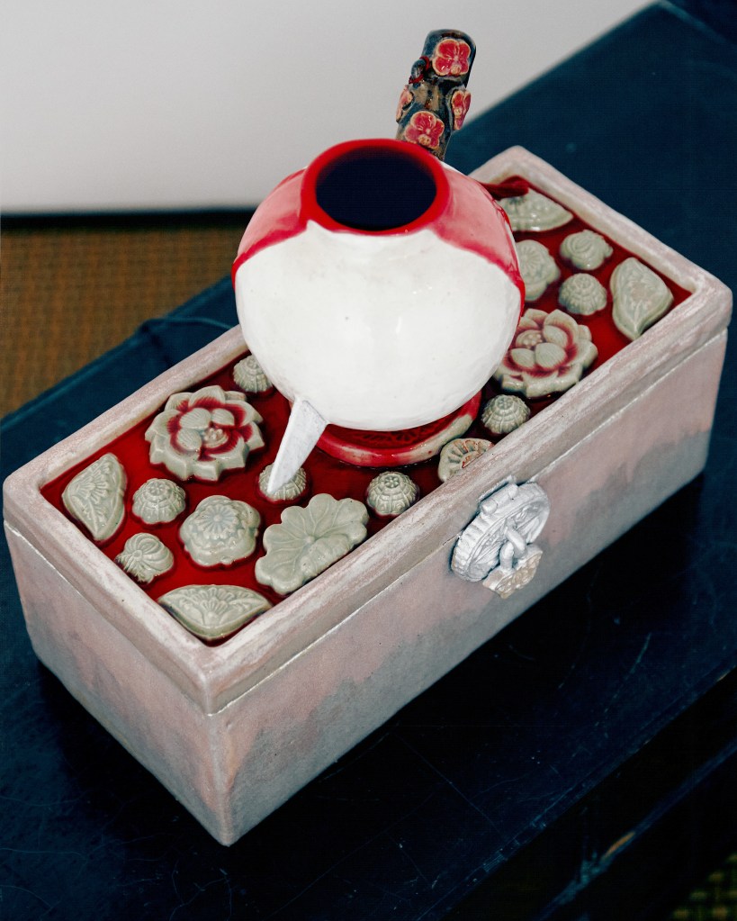 One of several fountains in the current exhibition, this work features a moon jar pierced through with a blade dubbed an eunjangdo. It was inspired, Phua notes, by the South Korean film, Homme Fatale (2019). The moon jar is a traditional Korean vessel, typically cast from white porcelain and asymmetrical in its top and bottom halves, that appeared during the Joseon dynasty. The moniker, a twentieth-century coinage, comes from its hue and shape. The moon jar became popular in Korea for its supposed embodiment of neo-Confucian values; its pristine appearance symbolized purity, and its unadorned surfaces, a sense of restraint. The eunjangdo is a silver knife carried or worn by women as an emblem of chastity (for maidens) and fidelity (for married women), and used in the service of self-defence or even suicide, if necessary. The meeting of the two objects in a violent encounter – one a signifier of morality, the other a weapon of self-sacrifice – suggests the turning of the pre-modern ideal of female virtue, which privileged death over the loss of chastity, on itself. The puncturing of the jar may be understood as an act of aggression against neo-Confucian strictures, a feminist reaction to historical power asymmetries. (Text by Louis Ho)