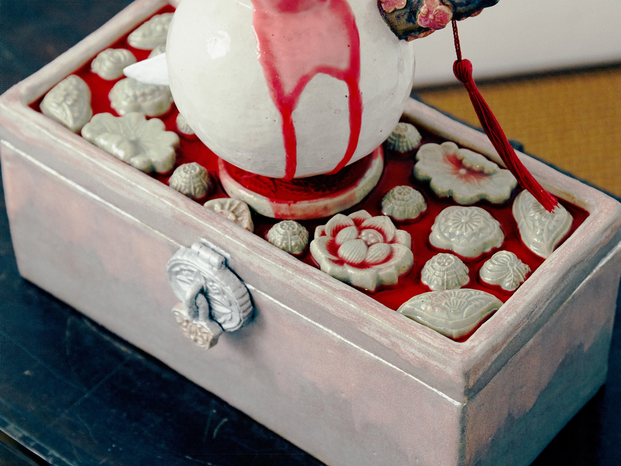 One of several fountains in the current exhibition, this work features a moon jar pierced through with a blade dubbed an eunjangdo. It was inspired, Phua notes, by the South Korean film, Homme Fatale (2019). The moon jar is a traditional Korean vessel, typically cast from white porcelain and asymmetrical in its top and bottom halves, that appeared during the Joseon dynasty. The moniker, a twentieth-century coinage, comes from its hue and shape. The moon jar became popular in Korea for its supposed embodiment of neo-Confucian values; its pristine appearance symbolized purity, and its unadorned surfaces, a sense of restraint. The eunjangdo is a silver knife carried or worn by women as an emblem of chastity (for maidens) and fidelity (for married women), and used in the service of self-defence or even suicide, if necessary. The meeting of the two objects in a violent encounter – one a signifier of morality, the other a weapon of self-sacrifice – suggests the turning of the pre-modern ideal of female virtue, which privileged death over the loss of chastity, on itself. The puncturing of the jar may be understood as an act of aggression against neo-Confucian strictures, a feminist reaction to historical power asymmetries. (Text by Louis Ho)