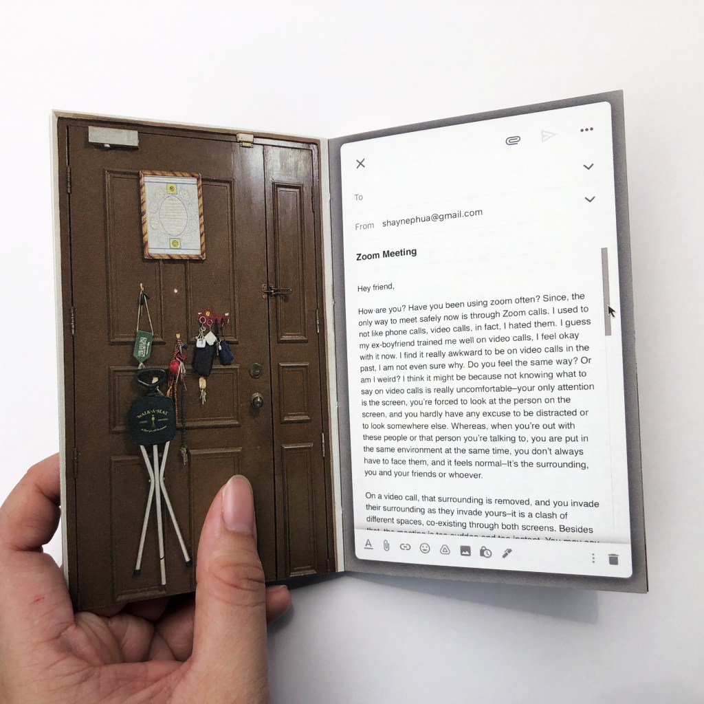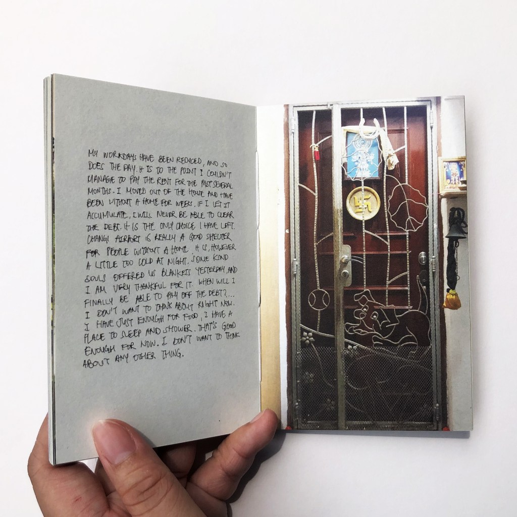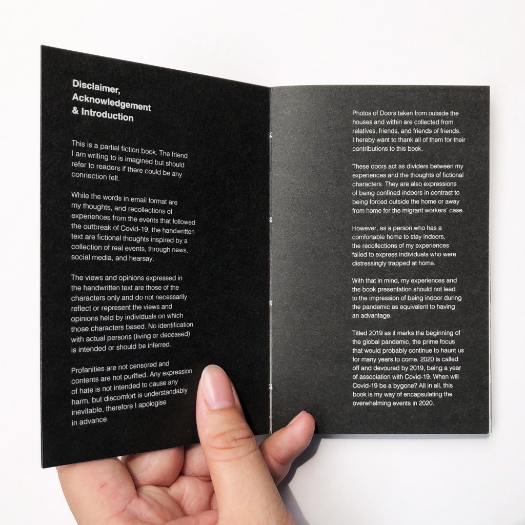 2019 is a partial fiction book. This book is my way of encapsulating the overwhelming events after the beginning of the pandemic in 2019. The words in email format are my thoughts, and recollections of experiences from the events that followed the outbreak of Covid-19, whereas the handwritten text are fictional thoughts inspired by a collection of real events, through news, social media, and hearsay. The doors act as dividers between my experiences and the thoughts of fictional characters. They are also expressions of being confined indoors in contrast to being forced outside the home or away from home for the migrant workers’ case.