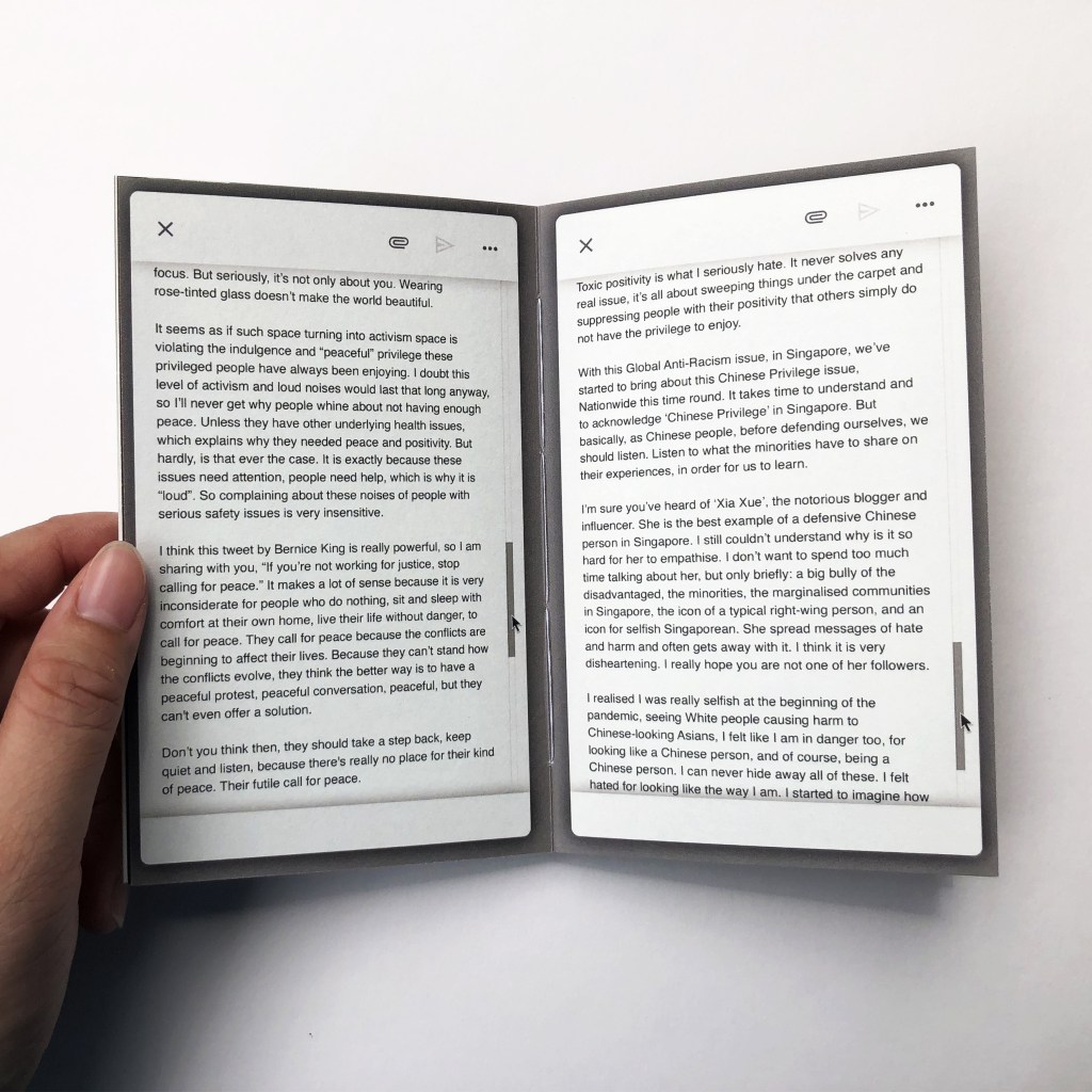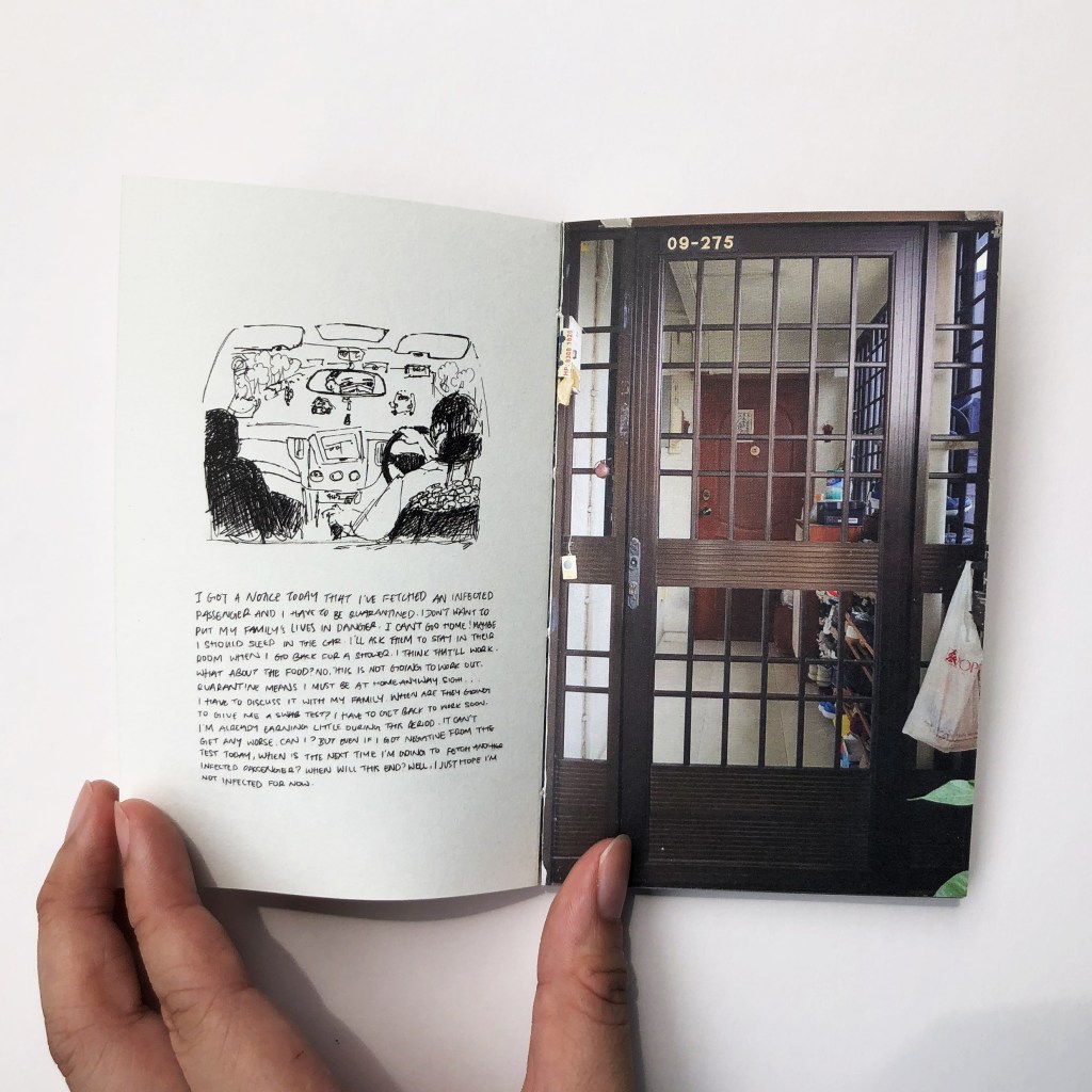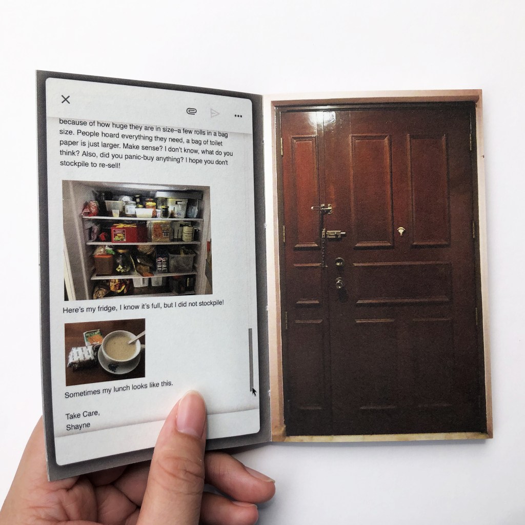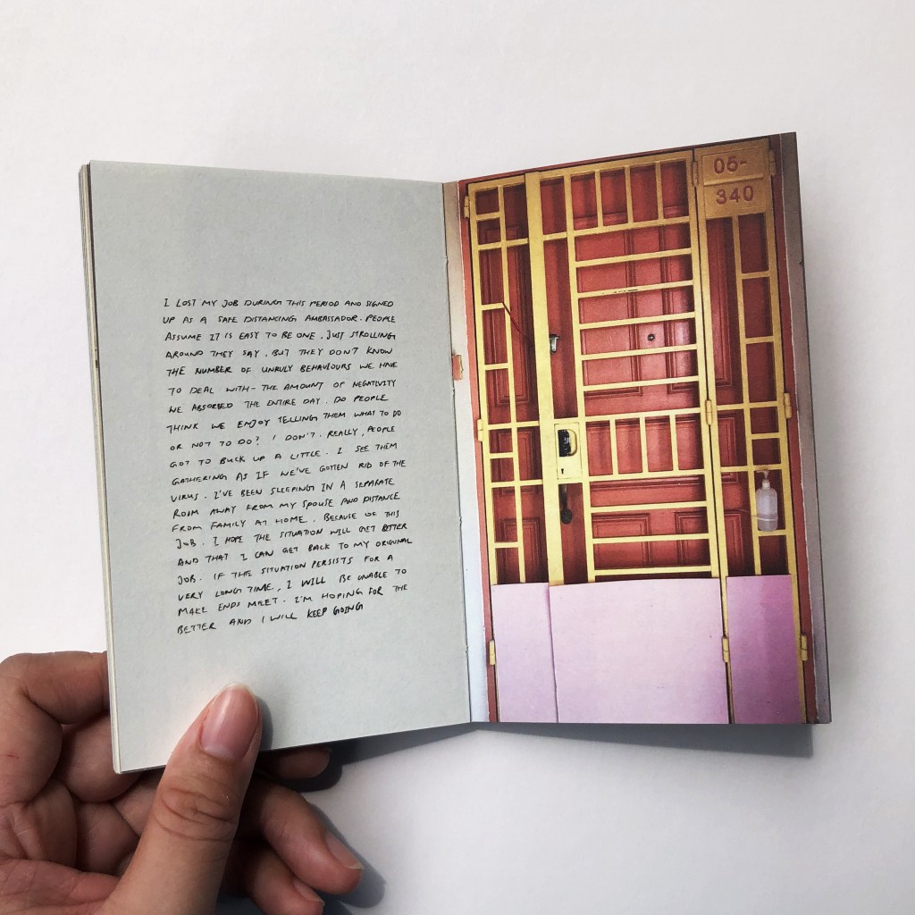 2019 is a partial fiction book. This book is my way of encapsulating the overwhelming events after the beginning of the pandemic in 2019. The words in email format are my thoughts, and recollections of experiences from the events that followed the outbreak of Covid-19, whereas the handwritten text are fictional thoughts inspired by a collection of real events, through news, social media, and hearsay. The doors act as dividers between my experiences and the thoughts of fictional characters. They are also expressions of being confined indoors in contrast to being forced outside the home or away from home for the migrant workers’ case.