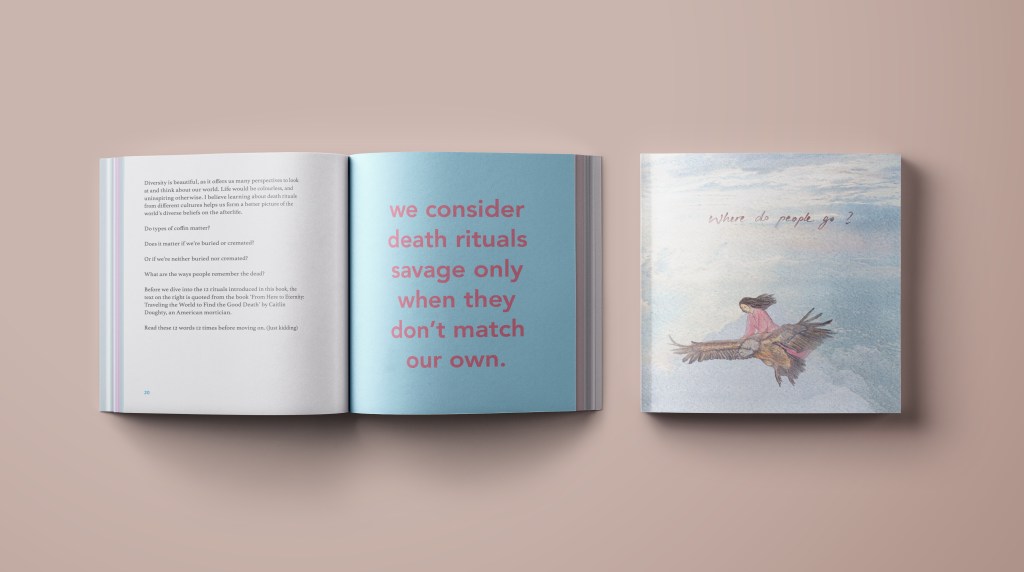 This book is made to express the beauty of afterlife beliefs from different cultures and religions. It also includes my family narratives surrounding the death of our loved ones, which reveals some fascinating circumstances of life after death. The use of colour pencils for illustrations is to manifest the innocent quality of having faith, which I find heart-warming. All in all, I hope this book encourages readers to see beauty in religious beliefs that contradict with theirs or death rituals that are bizarre because they are rare; and to see the charm in diversity.